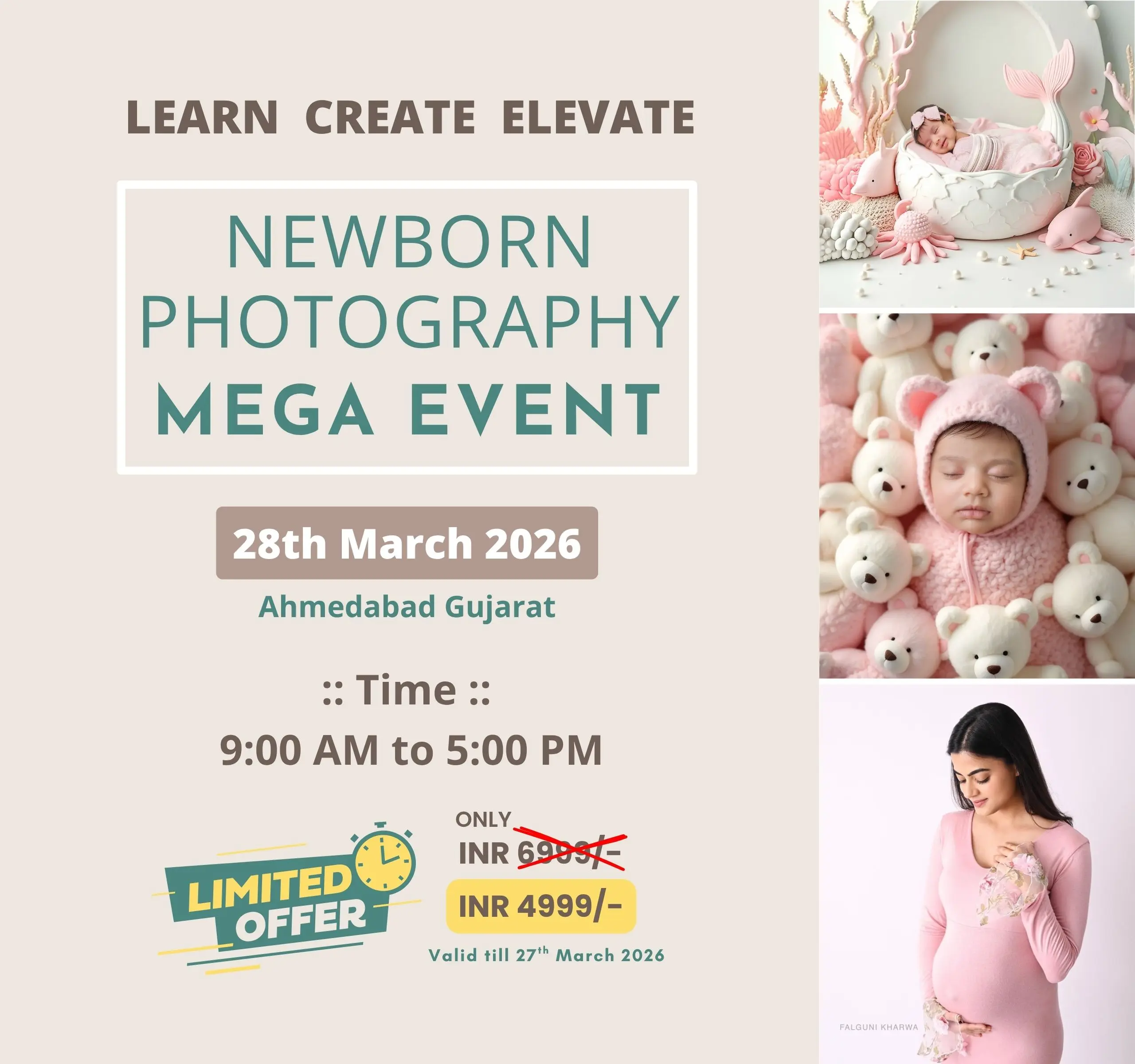 The event starts with meet and greet followed by a Keynote and AV presentation on How to work smart as a newborn photographer and learn Newborn saftey rules, skills of easy workflow learning your own style of creative wrapping, versatile beanbag posing with smart styling, Guidance on choosing props, learning about safety props, brush up on lighting technique for newborn photography, camera settings, creative angles and importance of Ai technology in Newborn photography. Work smart and earn more.